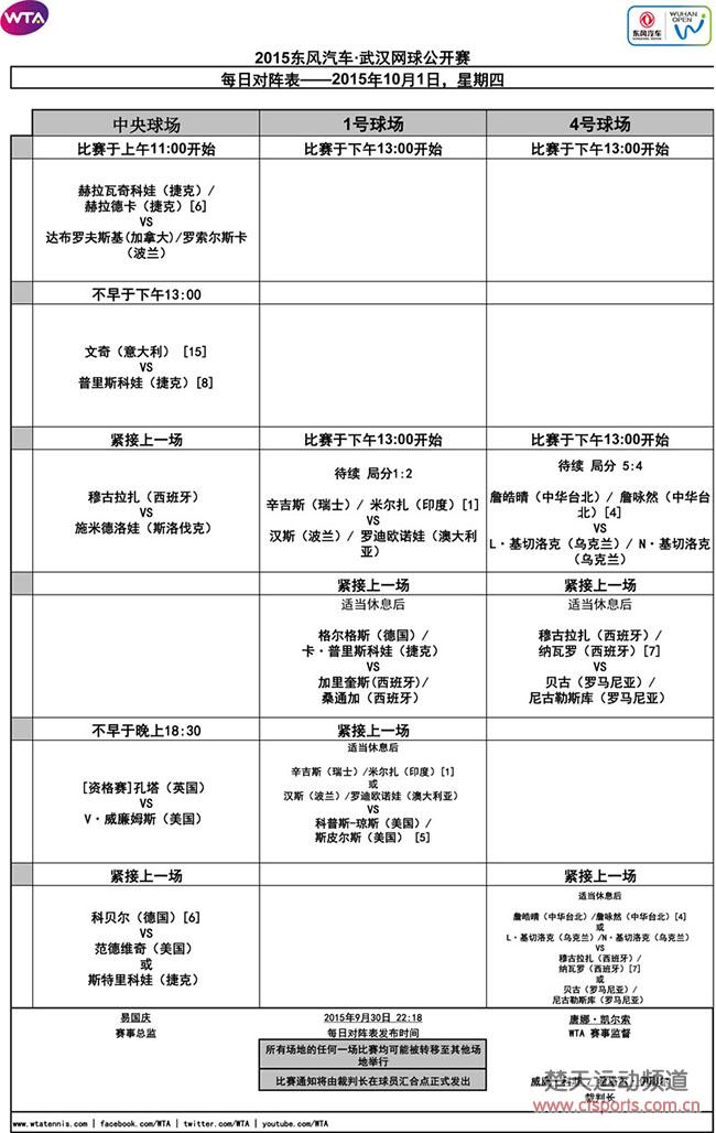 赛事纵横-2015年武汉网球公开赛半决赛名额争夺战将于今日正式开始,中央球场中午1点进行的首场1/4决赛为新晋美网亚军、意大利老将文奇VS捷克名将、赛会8号种子普里斯科娃;紧随其后上场的是西班牙天才少女、赛会5号种子穆古拉和斯洛伐克好手施米德洛娃的对决,晚场第一对出场选...