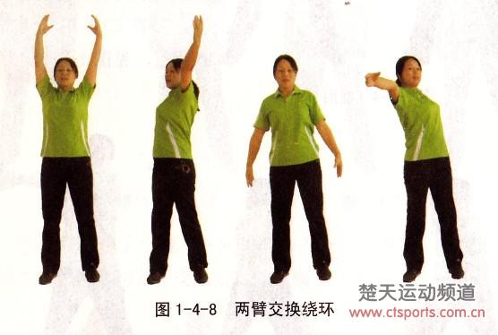 直立,两臂伸直上举,左臂向前右臂向后绕环,2×8拍后,两臂交换绕环,见图1-4-8。