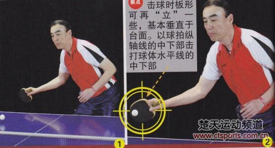 此外,在触球时,要尽量用球拍纵轴线的中下部击打球体水平线的中下部,也就是稍微有些“抬着打”的感觉。在正手图4-5中,我们可以看到出球是擦网后落台的,这是因为董为民击球时的板形稍有前倾,“立”的成分不够。