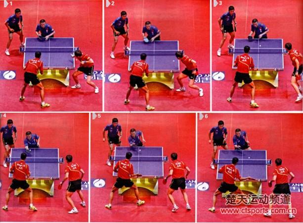本组图中的前三板是中规中矩的技战术套路,也是典型的双打战术。许听发球后,马琳摆短到王励勤的正手位,王励勤抢挑。发球和接发球需要严密的控制与反控制,由于比赛中任何一板进攻都能成为最后的致命一击,所以哪方能抢先进攻,哪方就占据了主动。