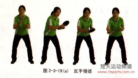 反手慢搓,站位近台偏左,右脚稍前,左脚稍后,两膝微屈。当对方来球时,持拍手臂左后上引拍,拍形稍后仰。击球时,前臂和手腕向前下方用力,同时配合内旋转腕动作,在来球的下降前期击球中下部。击球后,前臂随势前送,见图2-3-19。