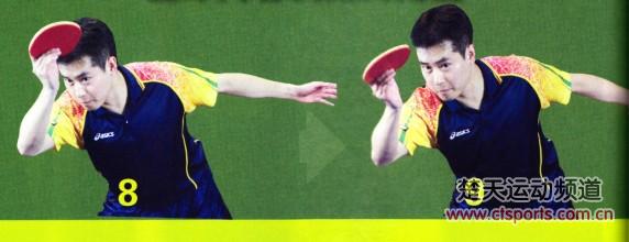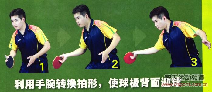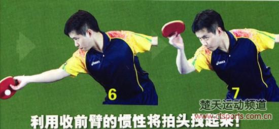 如果来球不太转或带有一些上旋,需要用大拇指多用点力压住球拍,使拍形更加前倾,避免击球弧线较高。反之则需要食指多用些力,使拍形立起来一些。由于动作的局限性,击球时如果光用手腕发力的话,出球是没有什么“劲力”的。所以要以前臂发力为主,利用前臂快速回收的惯性,将略微下沉的拍头带起来,顺势将球击出。如果来球带有下旋,还要利用手指的瞬间发力给球多加一些摩擦。