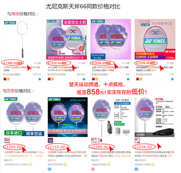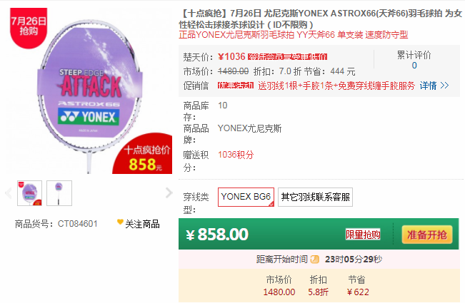 7月26日(周四),楚天运动频道网上商城十点疯抢继续进行,明天十点疯抢的商品将是尤尼克斯YONEX ASTROX66(天斧66)羽毛球拍。市场价1480元/支,十点疯抢活动价5.8折仅需858元/支(ID不限购)。机会不多,时间有限,先收藏加入购物车吧,更多优惠活动敬请关注楚天运动频道网上商城!