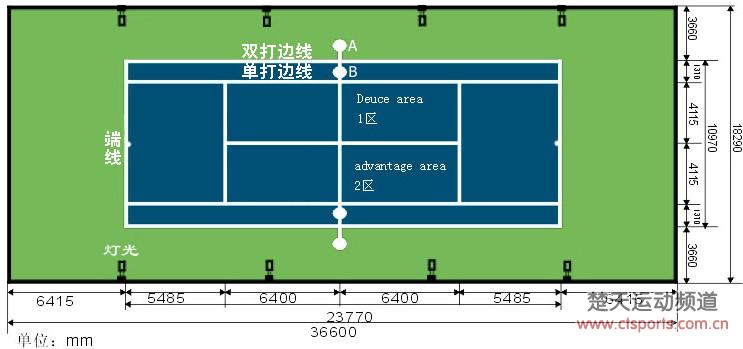 单打网柱或支架中心点B距离单打边线外沿为1‘(30.4cm)