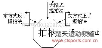 第一种叫作东方式握拍法。握拍时拍面与地面垂直,大拇指与食指呈V字形握在拍柄的中部。