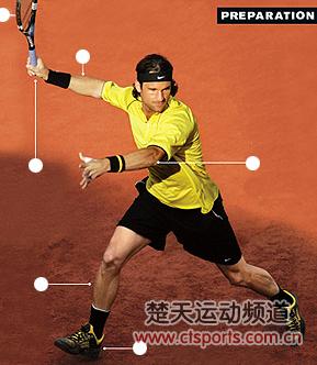 右脚:莫亚的脚趾指向了场地的一边,这样击球后转动的空间更大。如果他的脚趾向球网,这样转身的空间就很小了。