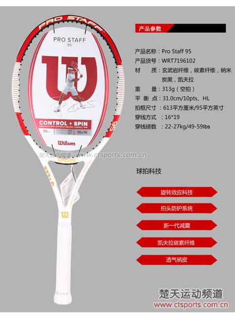 wilson PS95是2014年最新的一款网球拍 ,Pro Staff 精确于传统重量,Amplifeel带来最完美手感体验,经典控制拍框融合编织碳素纤维材料与克维拉结构,从而带来非同一般的性能。作为专业球拍,此款具备超乎期待的机动能力,非常适合今日强烈旋转击球的比赛。开放性线床使得网线咬球能力出色,非常容易击打出强烈旋转和切削,尤其是采用单芯聚酯网球线的时候。网前球拍具有高水准的触球和球感,令人印象深刻的灵活性使你很容易在合适的位置做出准确截击。因为采用新的科技(Amplifeel handle technology ),在拍柄部分也加入了岩纤纤维,使得球拍和球的联系更好,从而提高了球感。发球方面我们的测试人员找到更强的旋转和更稳固有力的速度。总之,这是款非常优秀的球拍,综合了良好的触球、击球感、灵活性和旋转能力。非常适合4.0+选手。
