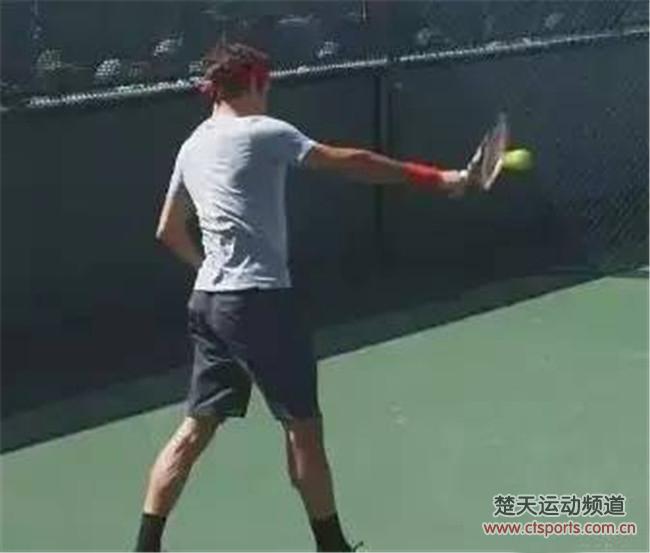 从向前挥拍开始,到击球结束,重心始终落在前脚持拍手向前挥拍,另一只手向后挥动,保持身体平衡,身体始终保持侧身姿势。