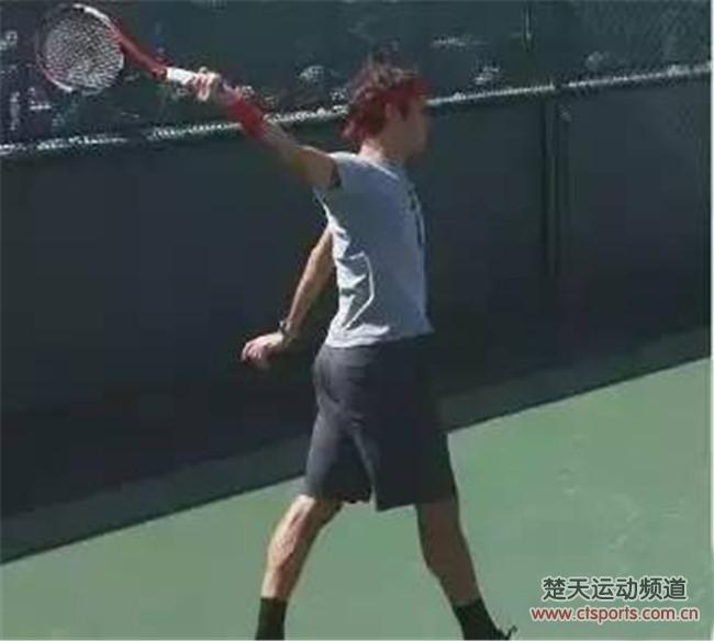惯性作用下,在随挥过程中,继续旋转球拍,结束时拍头指向了后方,整个过程经过仔细计算拍子旋转了450度。